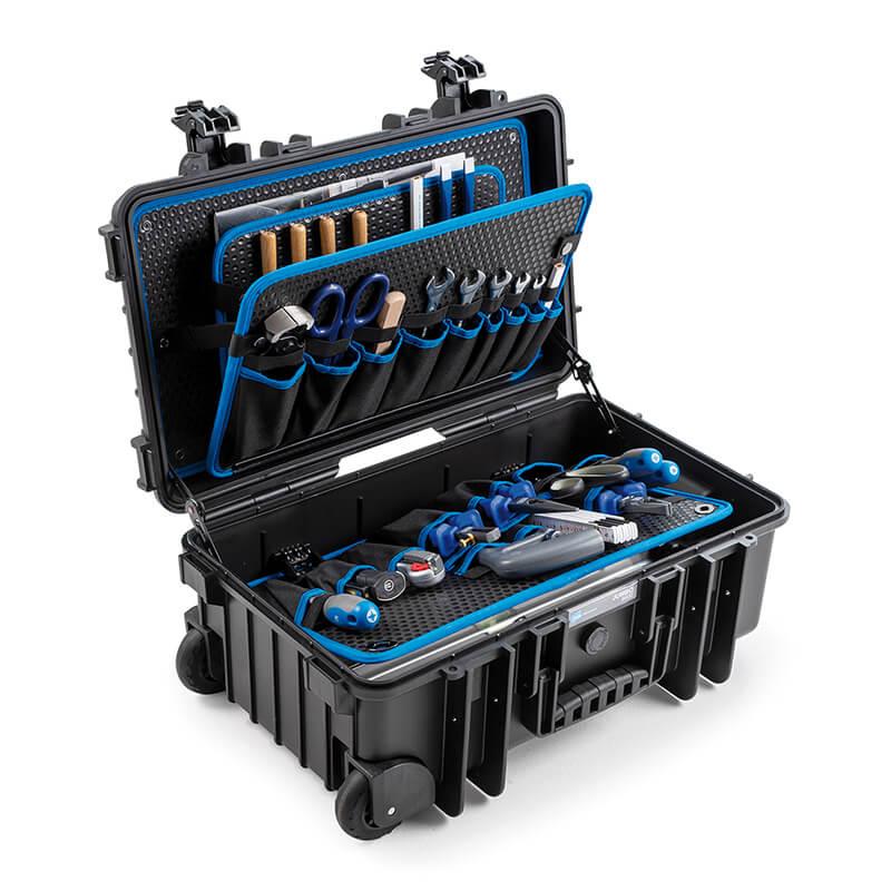 Verktøykoffert i sterk polypropylenplast, som egner seg spesielt godt til hard bruk. Kofferten har avtakbare verktøytavler med lommer og elastiske holdere for verktøyene, samt en base med aluminiums oppdelingssystem, som kan tilpasses individuelt. Kofferten har trallehåndtak og 2 hjul, slik at den er lett å transportere.