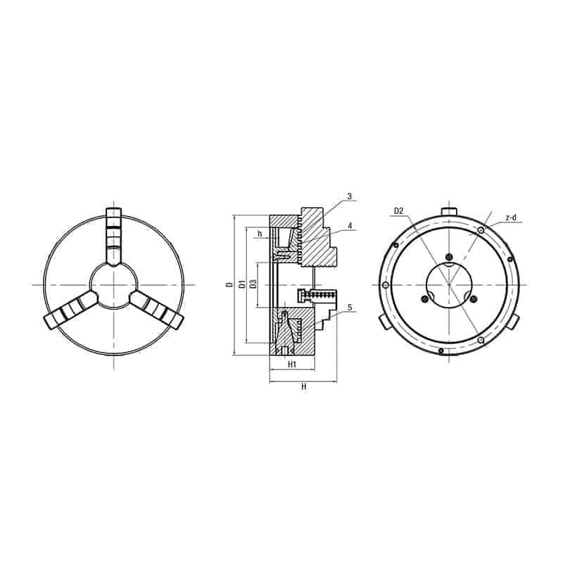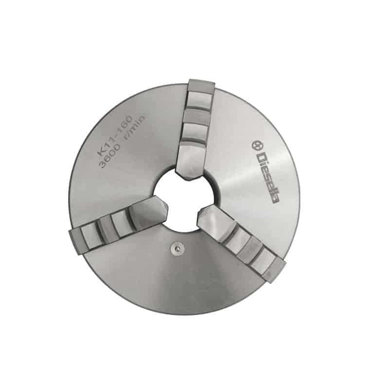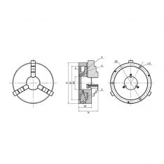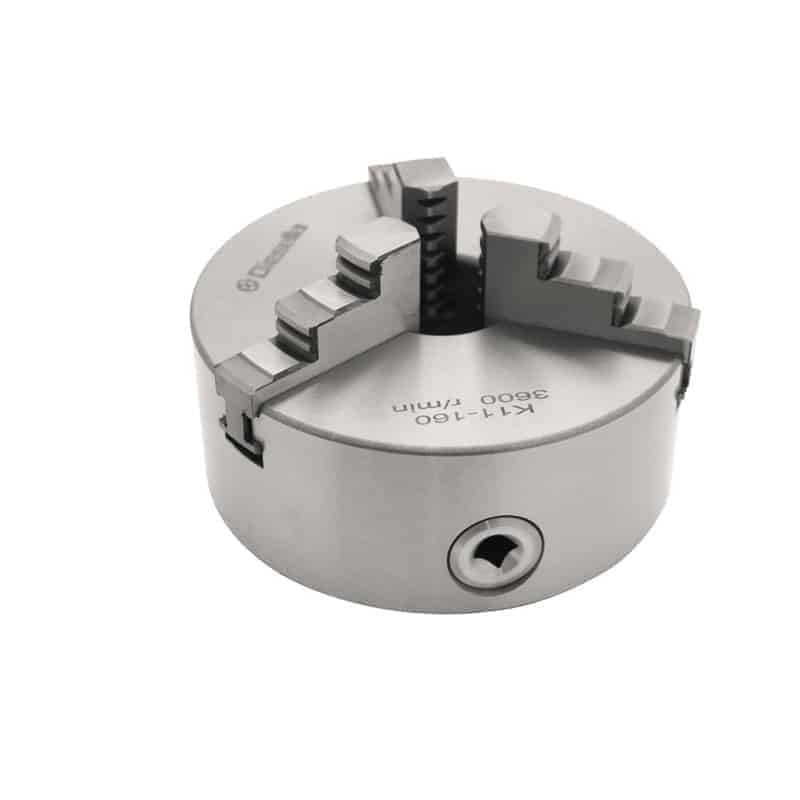 Selvsentrerende 3-bakket dreibenkchuck i støpejern. Leveres med T-nøkkel og 2 sett harde bakker, 1 sett utvendig og 1 sett innvendig.