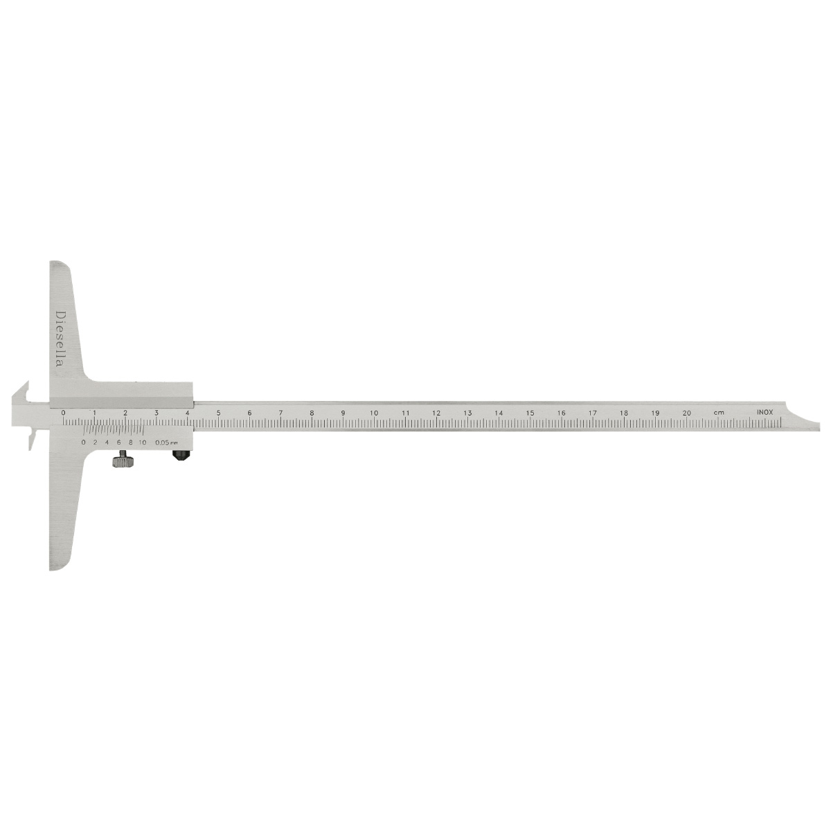 Mattforkrommet 3-i-ett dybdeskyvelære med låseskrue og bro på 150mm. Utstyrt med dobbel krok og målestang kan vendes. Oppfyller DIN 862 krav.
