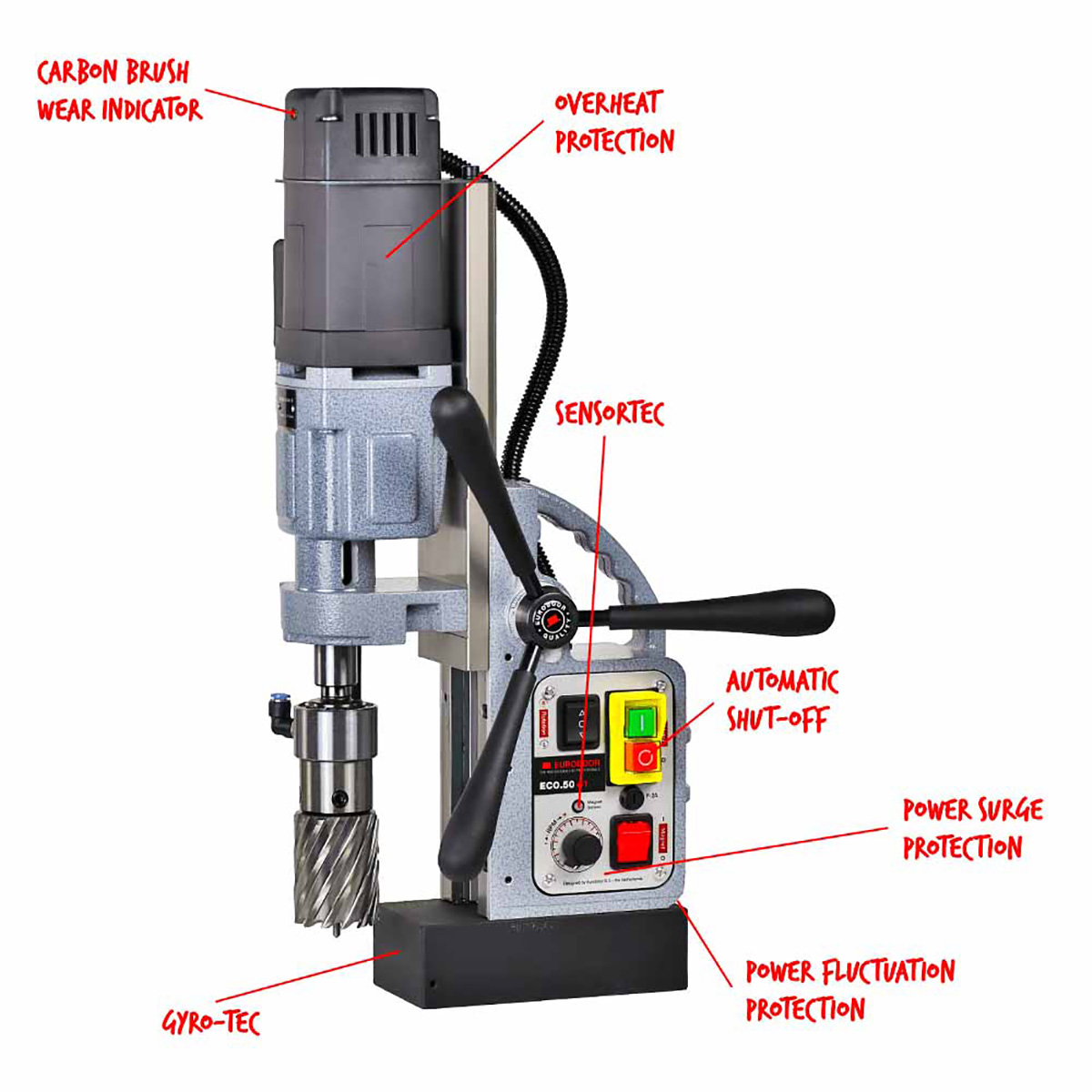 Euroboor ECO.50+/T med morsekon 2-spindel er utstyrt med innovativ elektronikk som gir økt sikkerhet. Reduserer risikoen for skade på maskinen, verktøyet og arbeidsstykket betydelig. Beskytter brukeren ved for store vibrasjoner eller plutselig forskyvning.