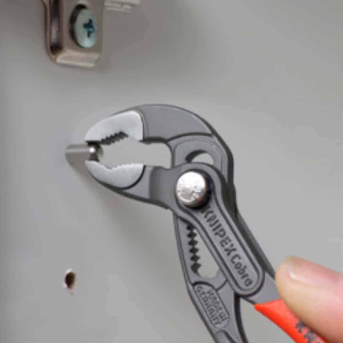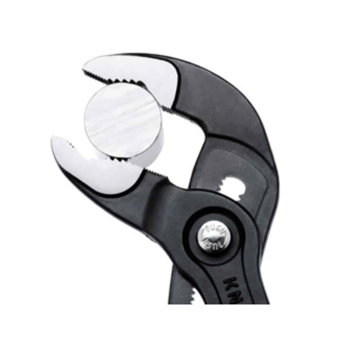 KNIPEX-«Cobra» – HiTech vannpumpetang. Slutt på omstendelig utprøving av riktig åpningsvidde. I stedet legges øvre kjevedel på arbeidsstykker, trykk på knappen og skyv til nedre bakke – genialt enkelt.