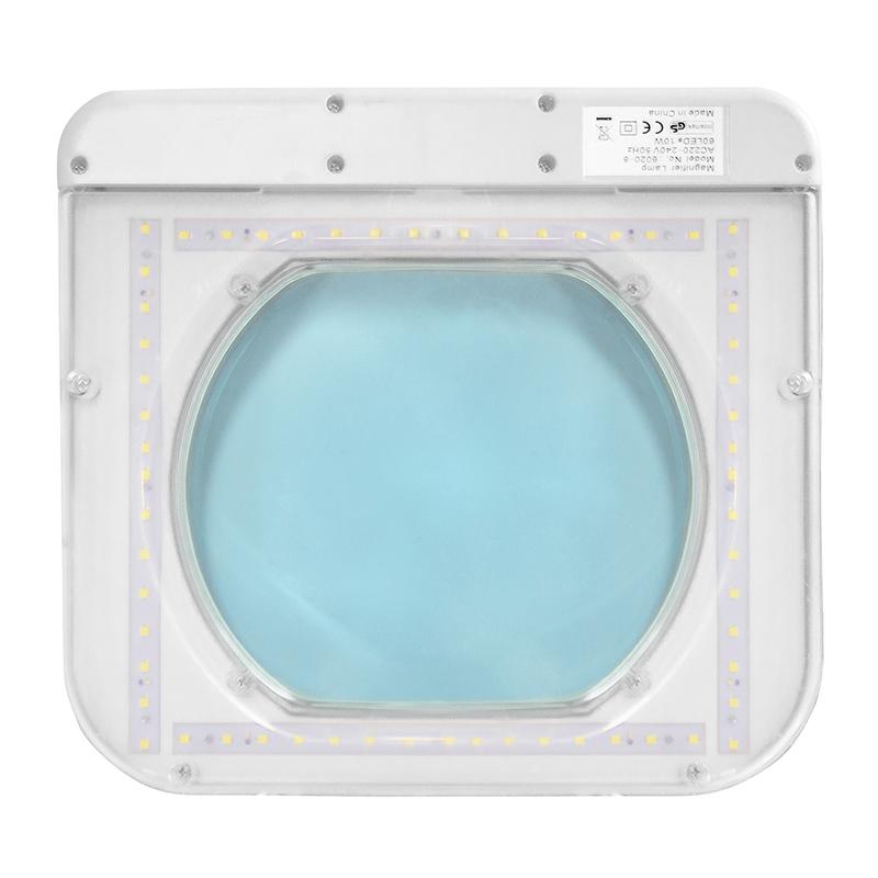 Profesjonell LED-forstørrelseslampe med EKSTRA STORT rektangulært synsfelt på 19×16 cm, glasslinse med 5 dioptrier (= 2,25 forstørrelse), fargetemperatur på 6300K og robust bordklemme.