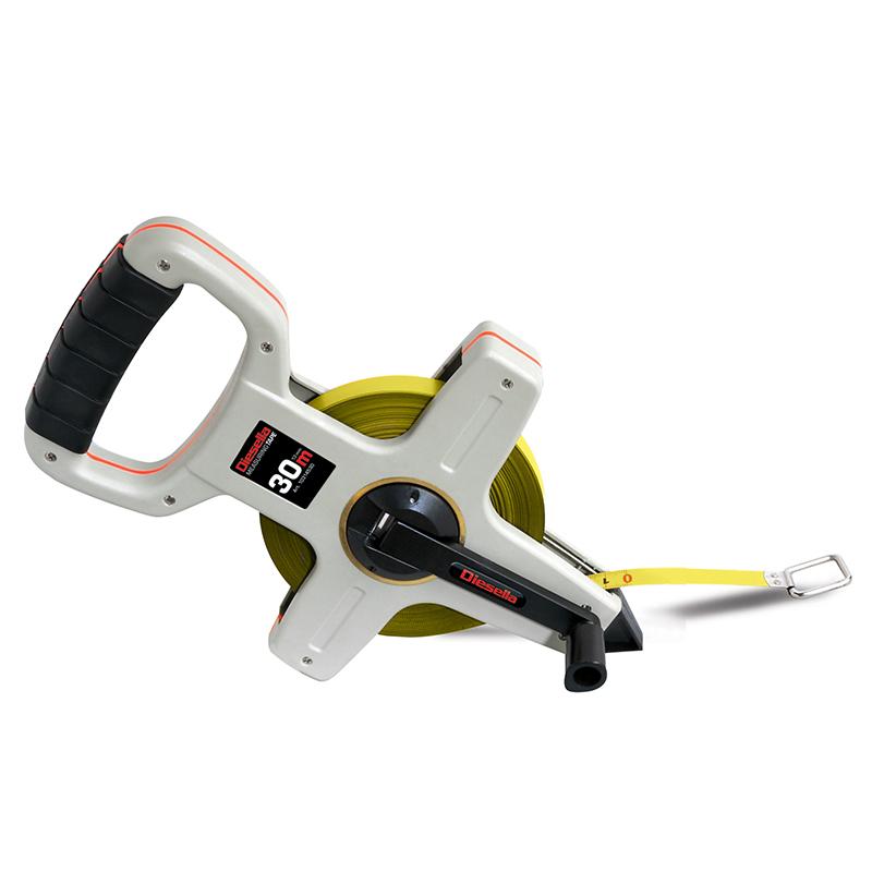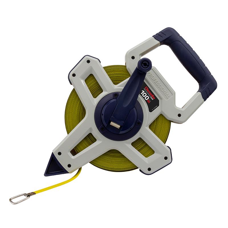 Kraftig gaffelmålebånd med nylonbelagt tape, som gjør målebåndet ekstra slitesterkt. Med gult målebånd, svart mm skala og røde tall for hver 1 meter.