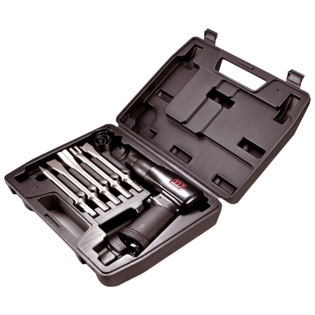 Sett med luftmeiselmaskin og fem meisler med rund tange.
