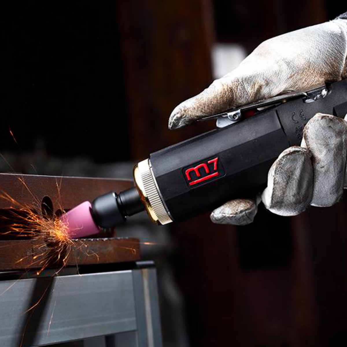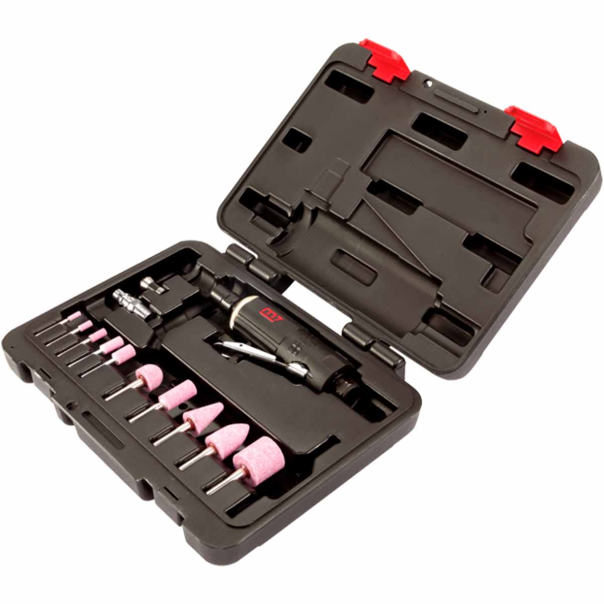 Pneumatisk rettsliper og slipesteiner levert i sett.