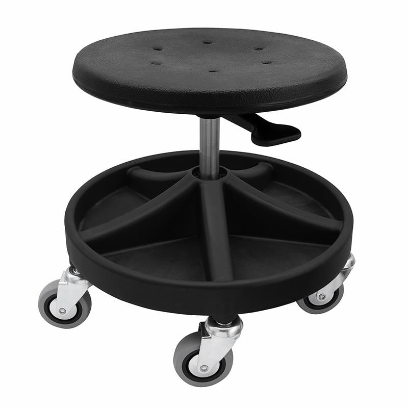 Robust taburett til industrien eller verkstedet med bekvemt sete i PU-skum og trinnløs innstilling av setevinkel. Velegnet til arbeid hvor man eksempelvis må sitte på huk, på kne eller stå foroverbøyd. Fast fotkryss i rødt eller svart med 5 rom, som gir mulighet for oppbevaring av bolter, skruer, verktøy m.m.