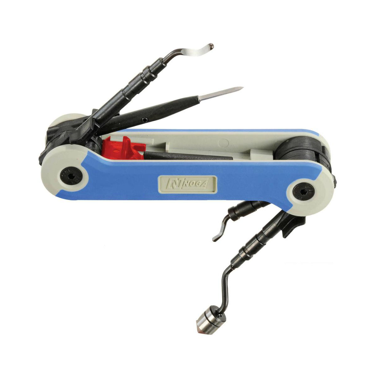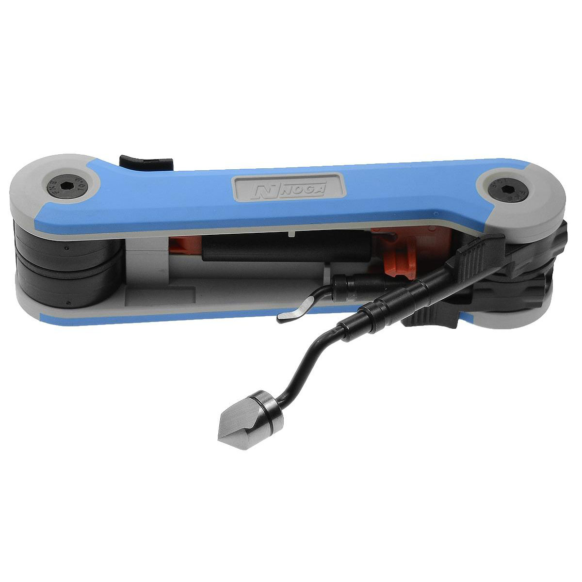 NOGA RG1000 er et multiverktøy for avrunding og gradering av kanter på stål, aluminium og plast. Verktøyet har fire ulike kniver som kan låses i posisjon under arbeidet.
