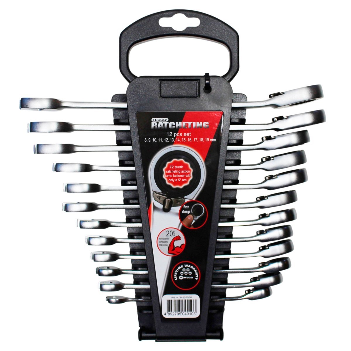 TECOS Skrallenøkkelsett (8-19 mm) har 12 skrallenøkler.