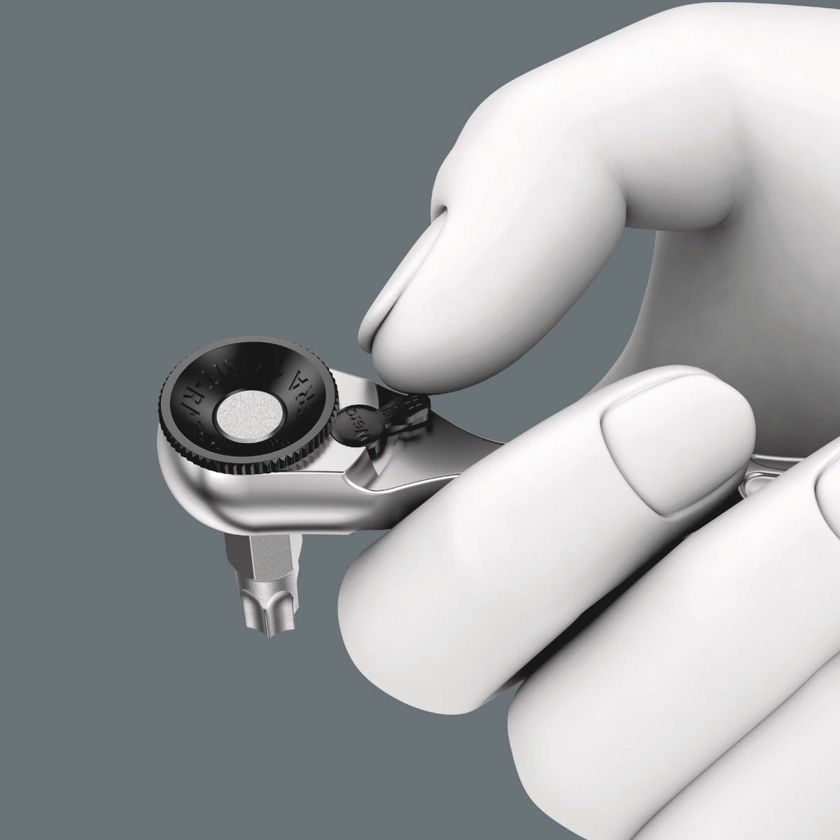 Bitskralle for raskt arbeid ved skruing der maskin eller konvensjonelt håndverktøy ikke er mulig på grunn av plassbegrensninger. Rask reversering fra rotasjon med klokken til mot klokken og omvendt via reverseringsspaken. Riflen på skrallehodet gir rask rotasjon (med tommelen). Enkel betjening, selv med bare én hånd.