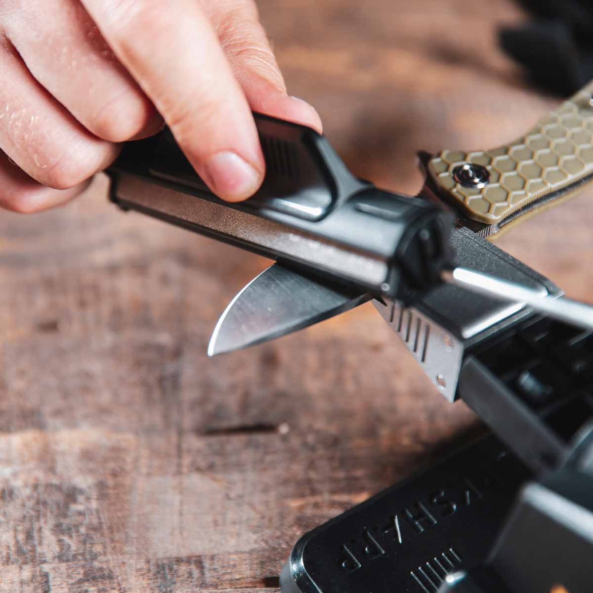 Oppgraderingssettet inneholder to Tri-Brasive™ holdere, en lærstropp, keramikkbryne til serraterte kniver og en eksklusiv oppbevaringsveske.