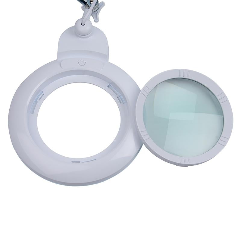 Lupelampe til profesjonelt bruk! Leveres med Ø127 mm 3D linse pre-installert (1,75X forstørrelse) samt en ekstra 5D linse (2,25X forstørrelse) som kan skiftes ut etter arbeidsoppgave eller behov. Leveres med robust bordklemme og 1,5 M ledning med EU Type F Schuko stik.
