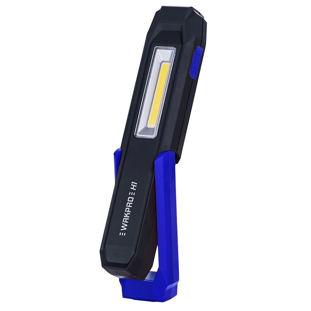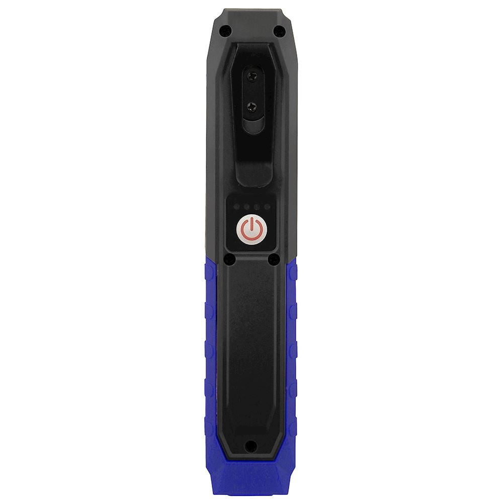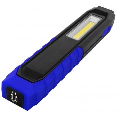 COB LED med sterk magnet i bunnen av den vippbare foten. Oppladbart Li-Ion batteri med batteri indikator, krok og belte clips.