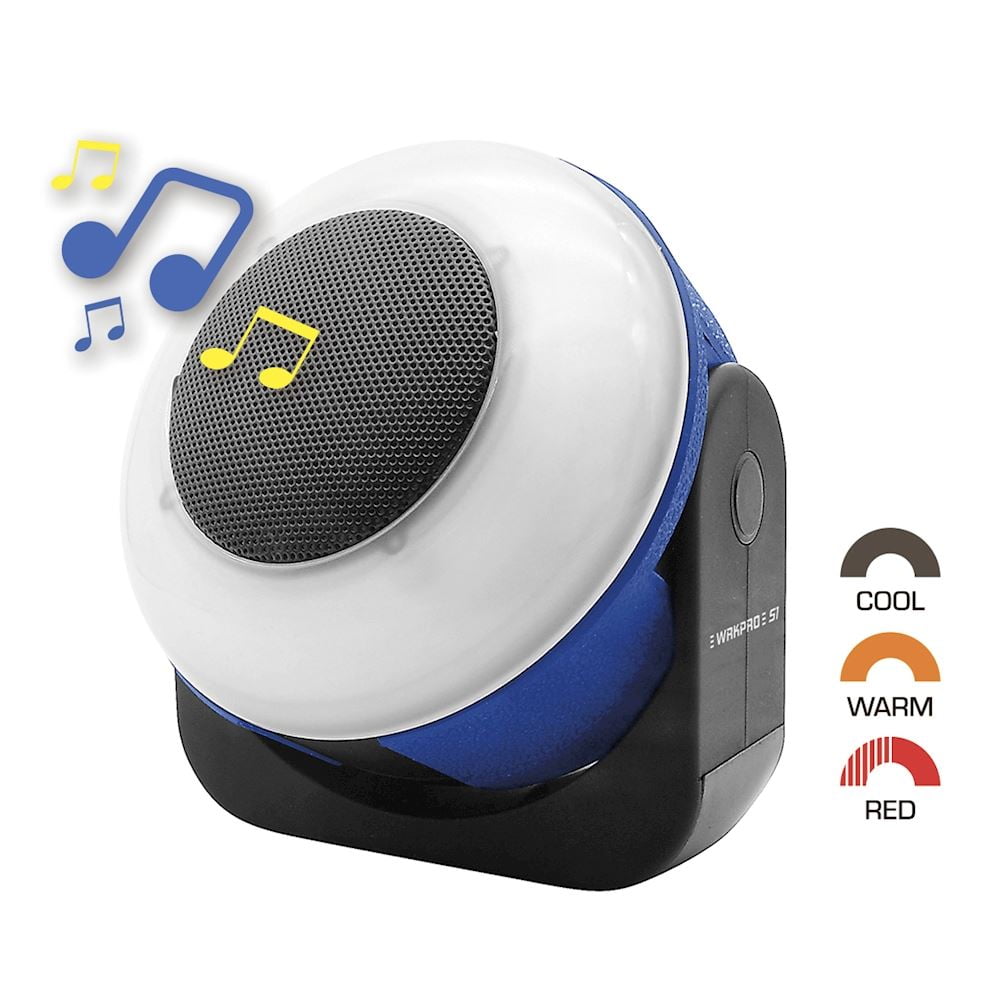 Smart arbeidslampe med innebygget 5W bluetooth høytaler og 4 forskjellige LED lys funksjoner (varmt, kaldt, rødt, blinkende rødt).